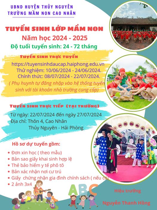 Mùa tuyển sinh cho năm học 2024 - 2025 đang đến gần, Trường MN Cao Nhân xin trân trọng thông báo và hân hoan chào đón Quý phụ huynh đăng ký tuyển sinh tại trường !