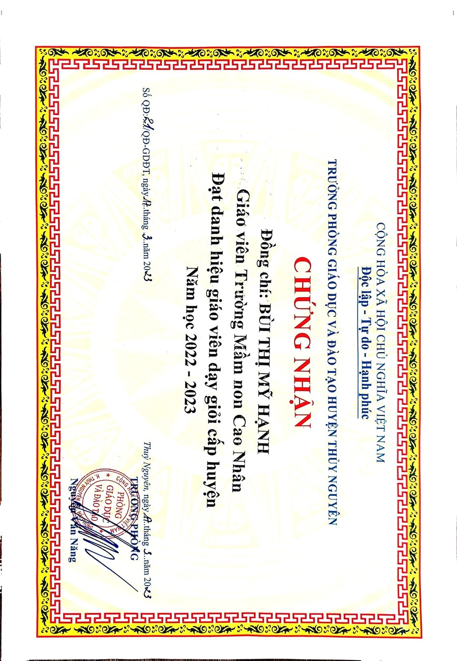 Đặc biệt, cô giáo Bùi Thị Mỹ Hạnh đã rất xuất sắc nhận được danh hiệu Á khoa Hội thi " Giáo viên dạy giỏi" bậc học MN năm học này