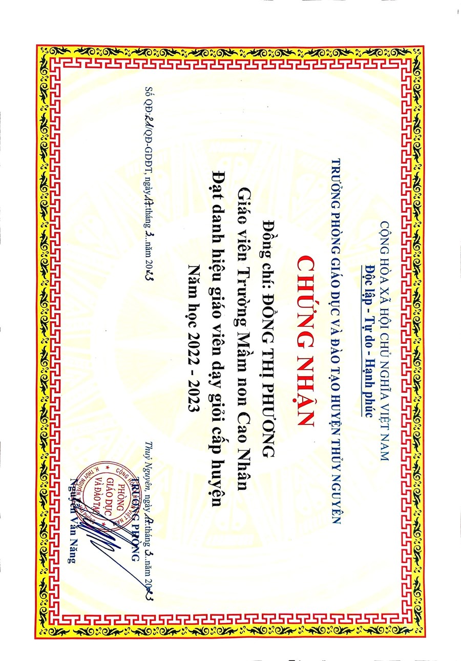 Trân trọng cảm ơn và chúc mừng 3/3 cô giáo MN Cao Nhân đã hoàn thành xuất sắc các phần thi báo cáo giải pháp và thi thực hành giáo viên dạy giỏi. Các em đã chính thức được công nhận danh hiệu " Giáo viên dạy giỏi" bậc học Mầm non năm học 2022 - 2023.
